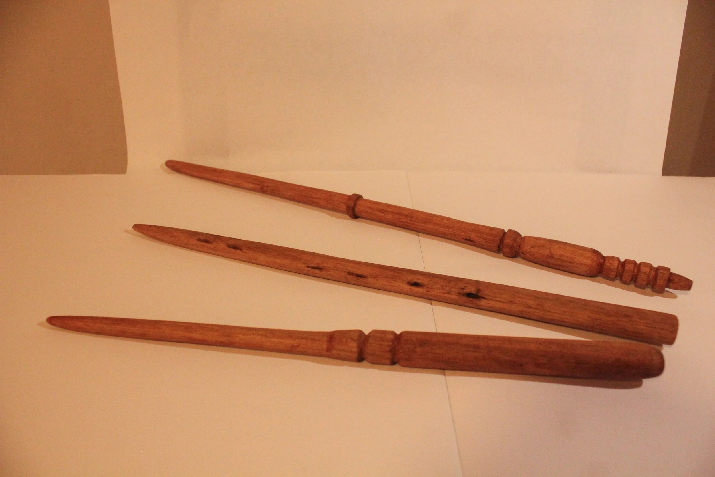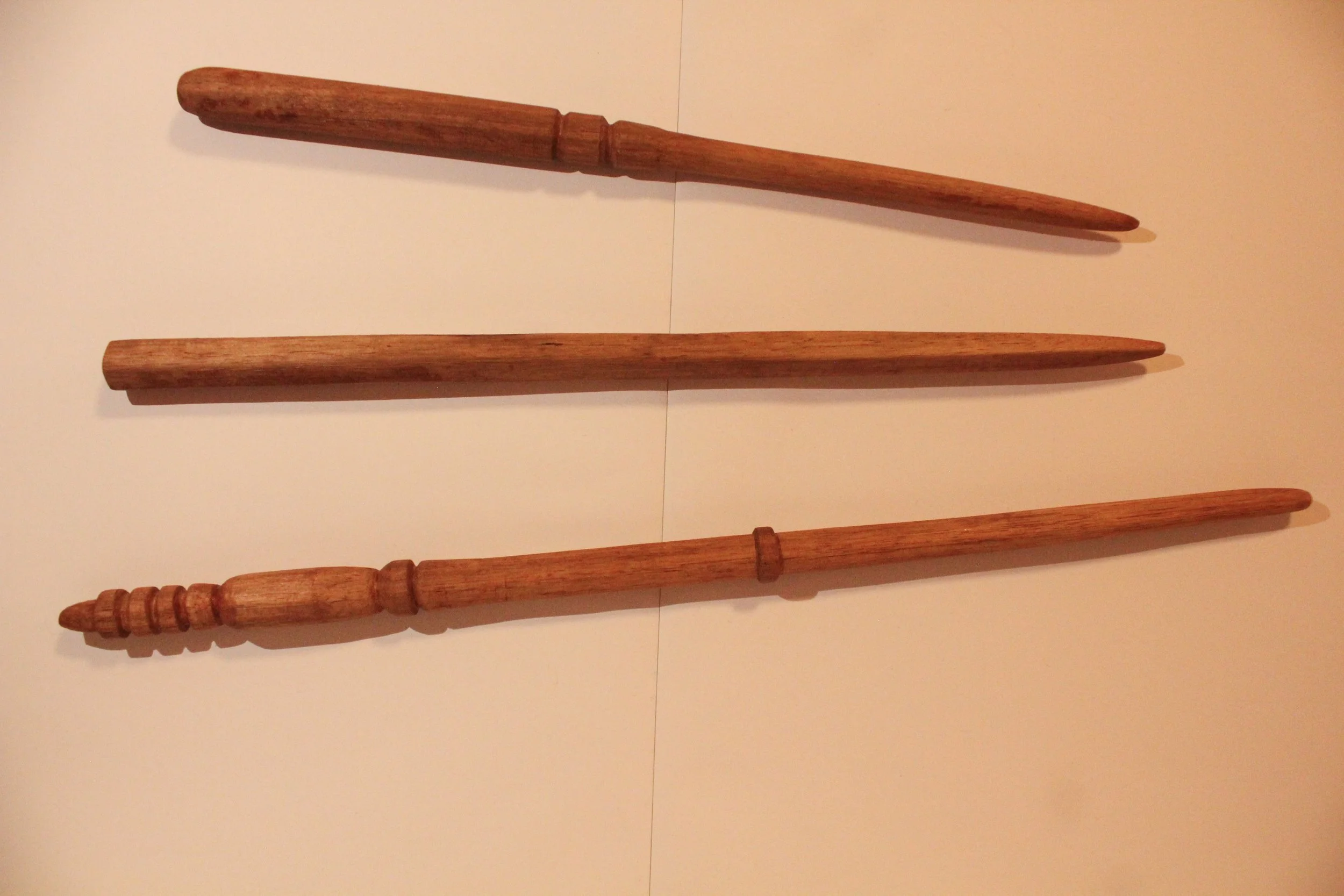 I carved three wooden wands each representing the wielder. The first made with a thicker, easy to control base, leading up to a decorative hand divide, and ending with a universal wand point. The second emphasising the previous tree’s structure and natural indentations. The third, the longest of the three, shaped for a teacher. A reminder of the many wood carving and impressions in the architecture of old libraries. I then sandpapered and stained to finish.
