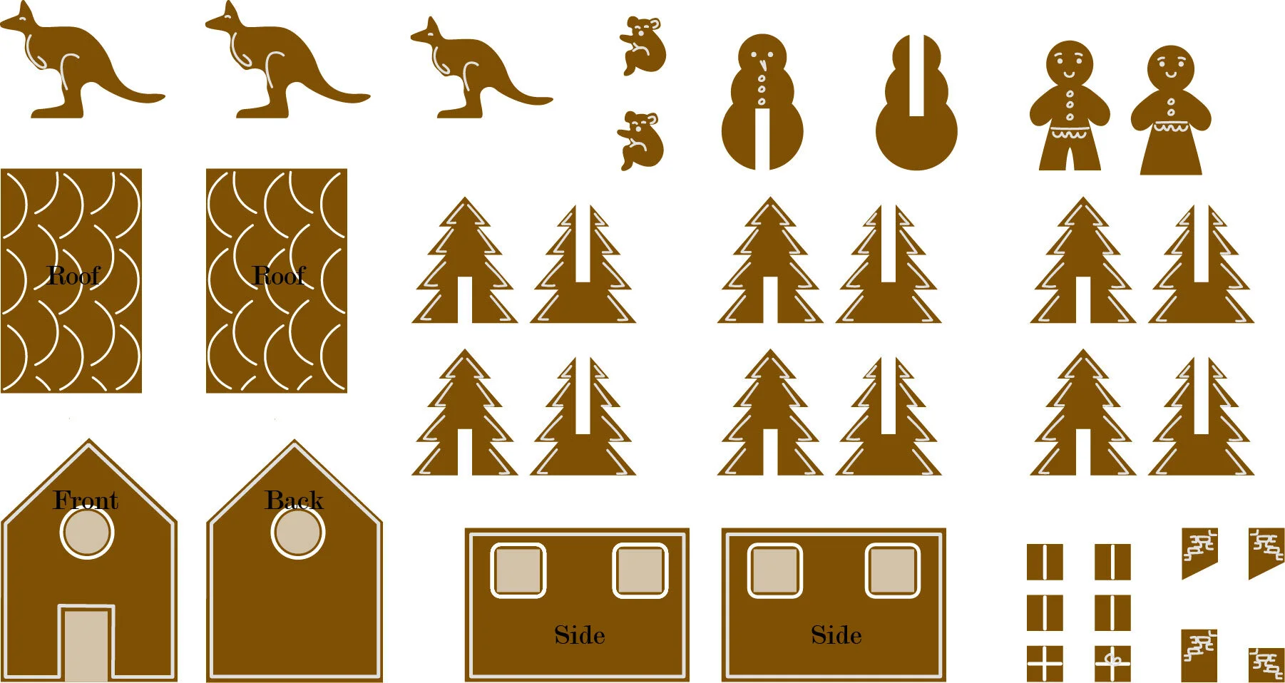 Decided to make a gingerbread house for a Christmas Party. Designed these cut-outs to make cutting out the gingerbread dough easier. If you are going to use this as a reference please make a bigger hole for the trees, and snowmen to fit into each other, because my dough expanded in the oven, they no longer fit together.